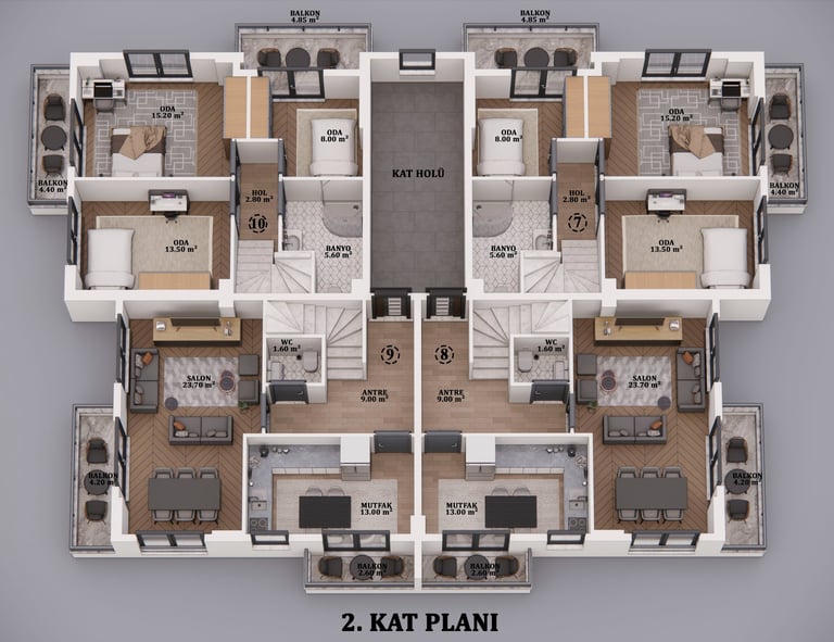 2 adet 4+1 dubleks daire – Üst katta ekstra oda & teras seçenekli ( 165 m²)