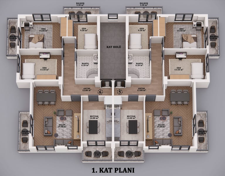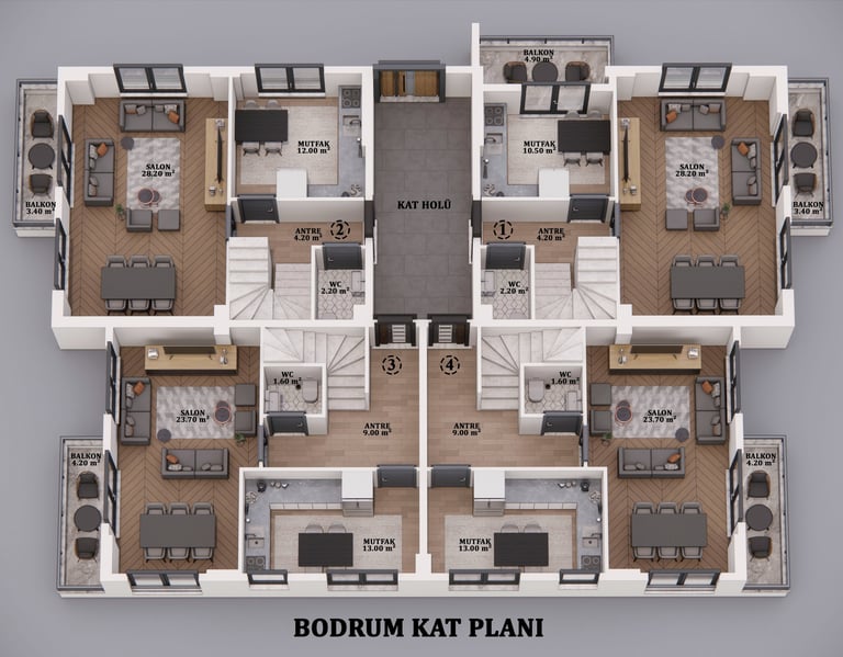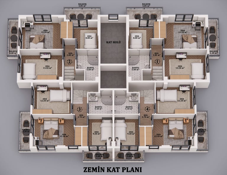 4 adet 3+1 normal daire – Geniş salon, aydınlık odalar (110 m²)