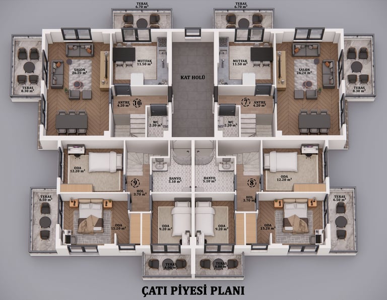 Toplamda 10 Daire: Her biri 3+1, 120-130 m² genişliğinde, ferah ve fonksiyonel yaşam alanları.